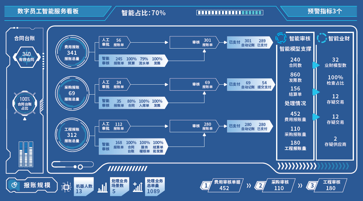 數(shù)字員工輔助報(bào)賬系統(tǒng),聚合各系統(tǒng)交易信息,標(biāo)準(zhǔn)化審核事項(xiàng),完善業(yè)財(cái)管理體系